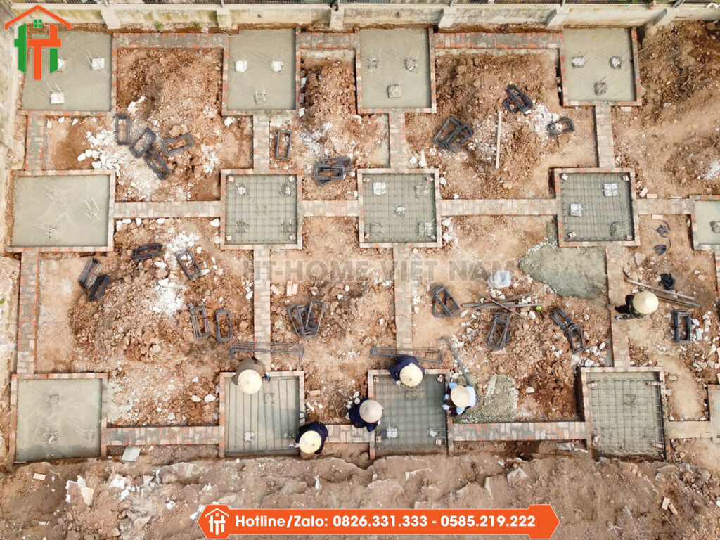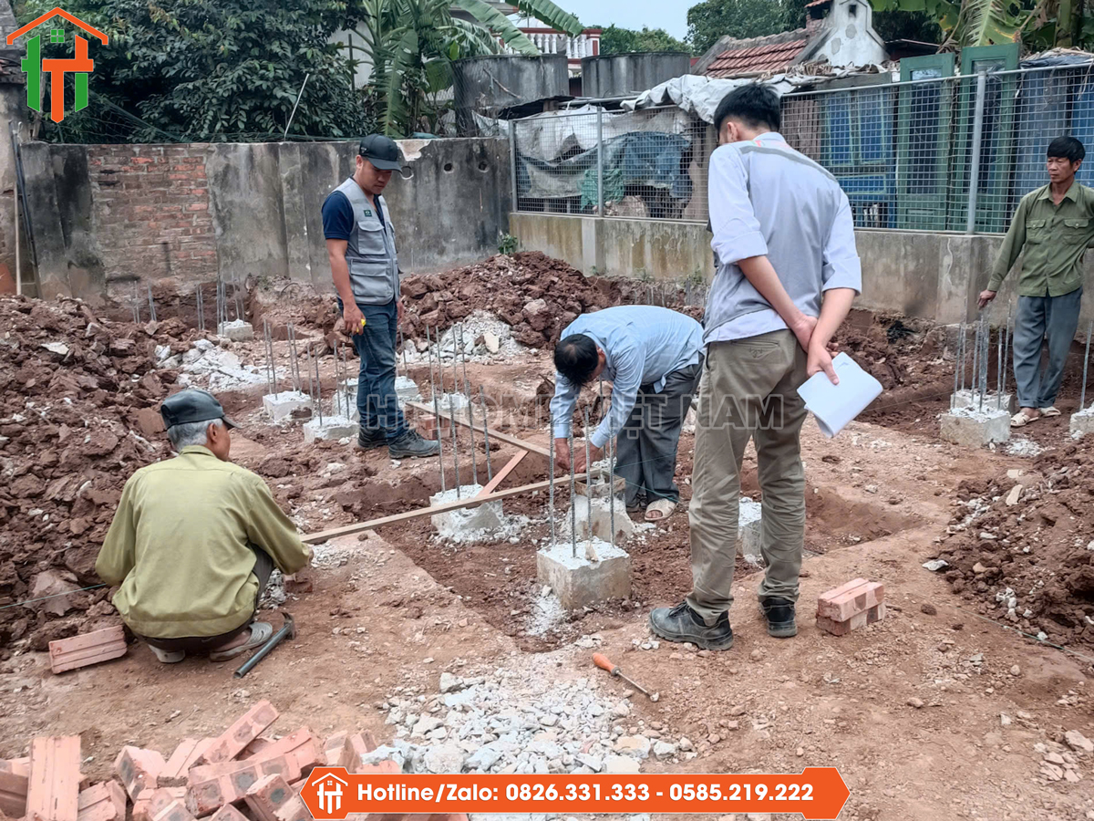 Đội ngũ kỹ thuật tiến hành định vị tim móng theo đúng kích thước phủ bì 8x12m, kiểm tra cao độ nền và chuẩn bị mặt bằng thi công.