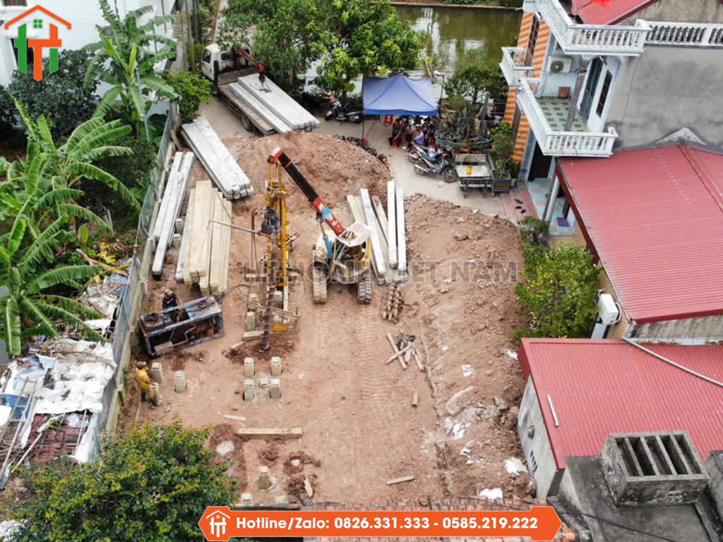 Công trình sử dụng hệ cọc bê tông ép tải để gia cố nền đất. Từng cọc được ép đến khi đạt lực thiết kế, có theo dõi nhật ký thi công để đảm bảo không xảy ra lún lệch. Với quy mô nhà 2 tầng diện tích 8x12m, việc ép cọc đúng kỹ thuật giúp toàn bộ công trình ổn định ngay từ phần móng.