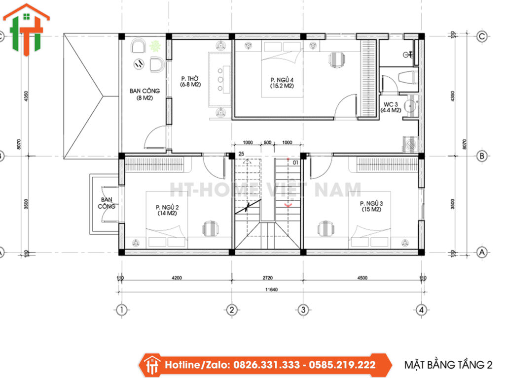 - Tầng 2 bố trí riêng tư với 3 phòng ngủ và phòng thờ