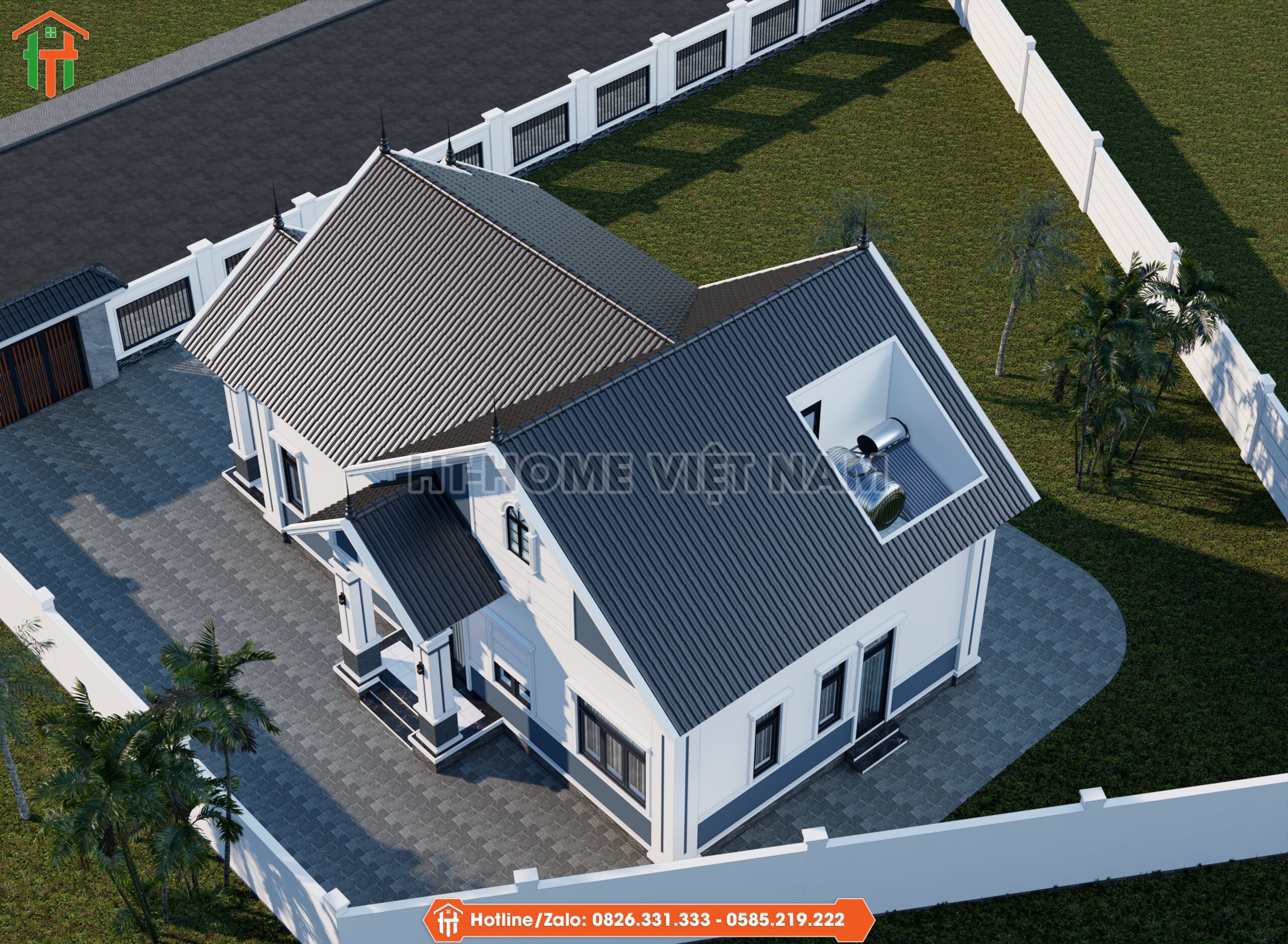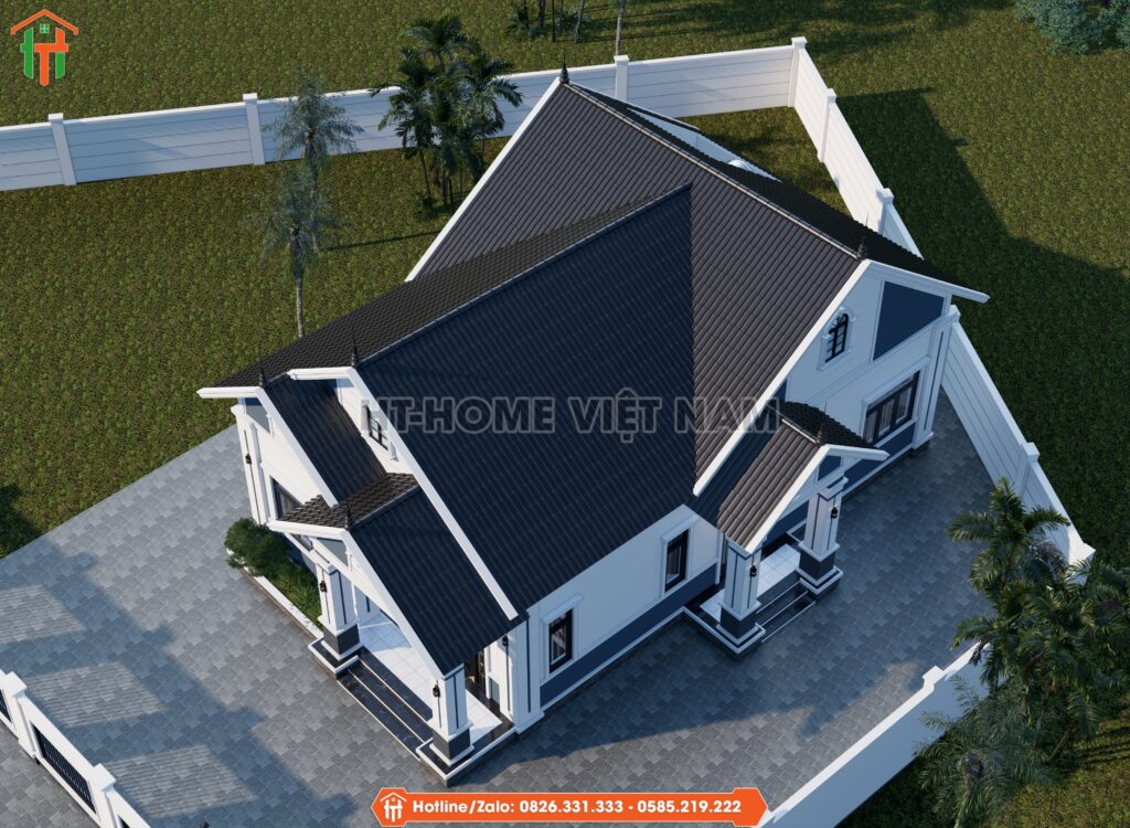Mái thái giật cấp nhiều lớp là điểm nhấn quan trọng của công trình. Độ dốc mái lớn giúp căn nhà thoát nước tốt. Các chi tiết vòm nhỏ phía trước tạo nét mềm mại. Đây là phương án cải tiến HT-Home áp dụng trong dòng mái thái 2026.