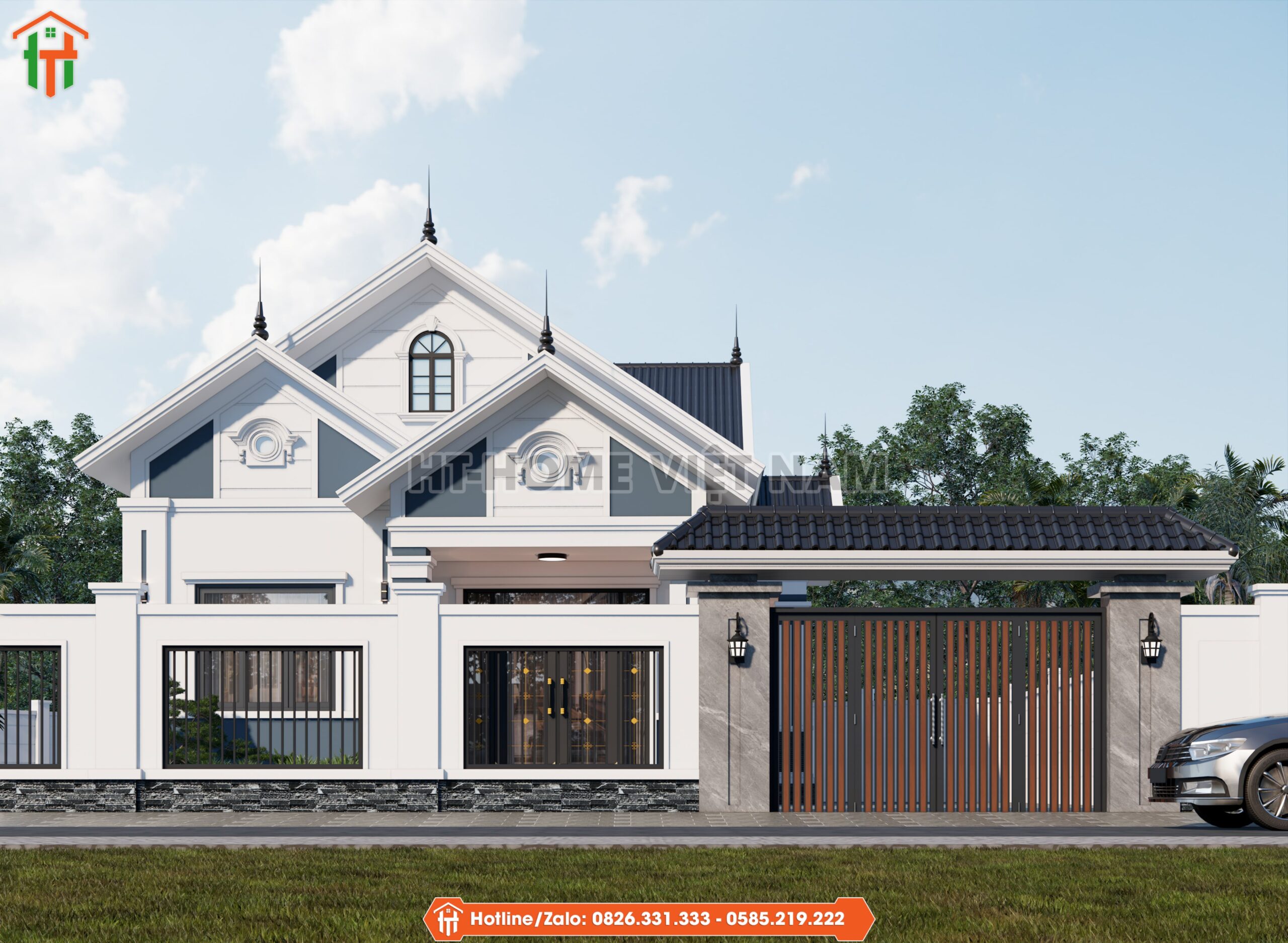 HT-Home Việt Nam định hướng mẫu thiết kế mái thái 1 tầng theo phong cách sang trọng và bền vững. Cổng thép kết hợp lam gỗ tạo cảm giác chắc chắn và hiện đại. Tường rào sơn trắng kết hợp đá chân tường giúp công trình sạch và nổi bật. Sảnh chính sử dụng bậc tam cấp đá xám, tạo sự bề thế ngay mặt tiền.