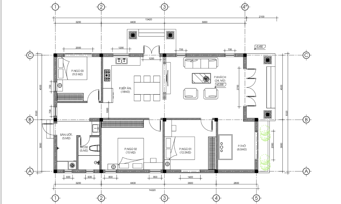 Mẫu thiết kế mái thái 1 tầng này đáp ứng tốt nhu cầu của gia đình 3–5 người. Ngoại thất sang trọng, nội thất tối ưu và công năng rất hợp lý.