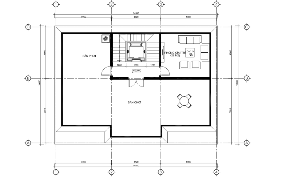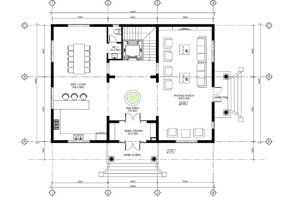 Ngôi biệt thự được bố trí công năng khoa học để đảm bảo tiện nghi tối đa cho gia đình. Tầng một gồm sảnh chính, phòng khách rộng, khu bếp ăn, một phòng ngủ và phòng thờ. Không gian khách được đặt trung tâm, trần cao thoáng, đón sáng tự nhiên từ hệ cửa lớn. Bếp và phòng ăn liên thông, tạo sự kết nối ấm áp trong sinh hoạt hằng ngày.