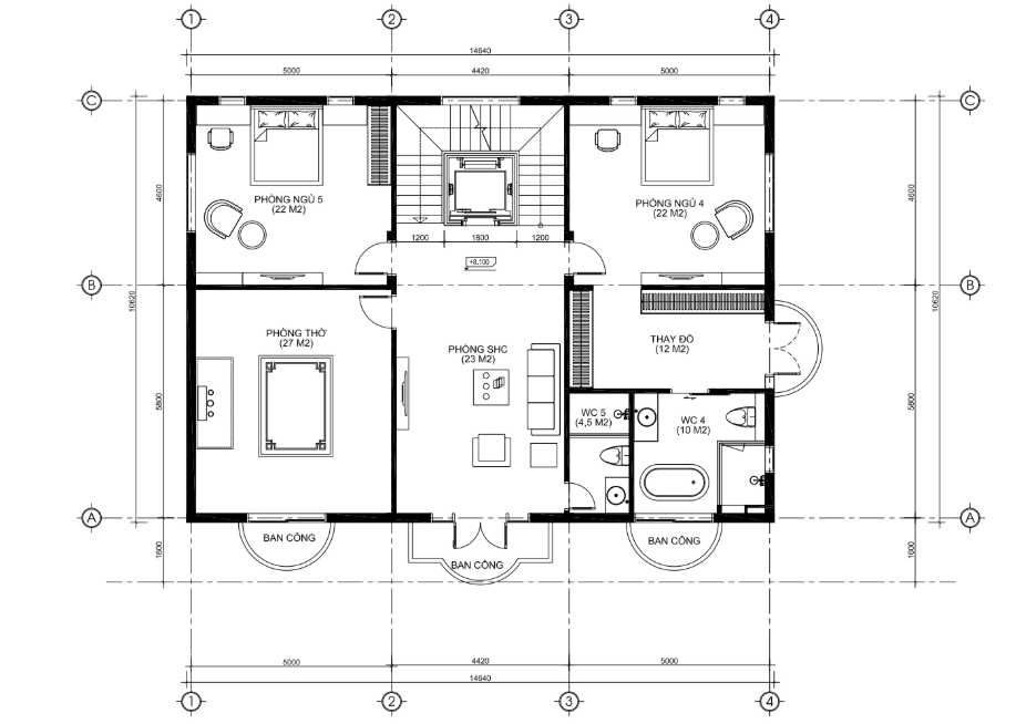 Tầng hai gồm khu sinh hoạt chung và ba phòng ngủ thoáng sáng. Phòng master có cửa mở ra ban công, tầm nhìn hướng vườn, tạo cảm giác thư giãn tuyệt đối. Hai phòng ngủ phụ được bố trí hợp lý, mỗi phòng đều có cửa sổ lớn đón ánh sáng và gió tự nhiên. Khu vệ sinh chung đặt cuối hành lang, thuận tiện và riêng tư.